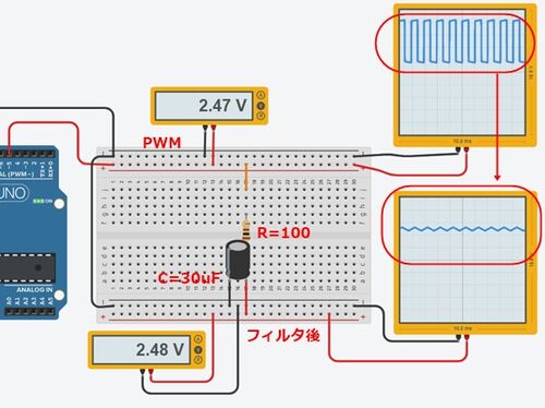 今回はArduino Unoでのアナログ電圧の出力を利用して、波形電圧を出力する方法を紹介する。Arduino Unoの場合アナログ電圧を出力する場合、0~5Vの中間電圧はPWM(Pulse Width Modulation)により出力される。